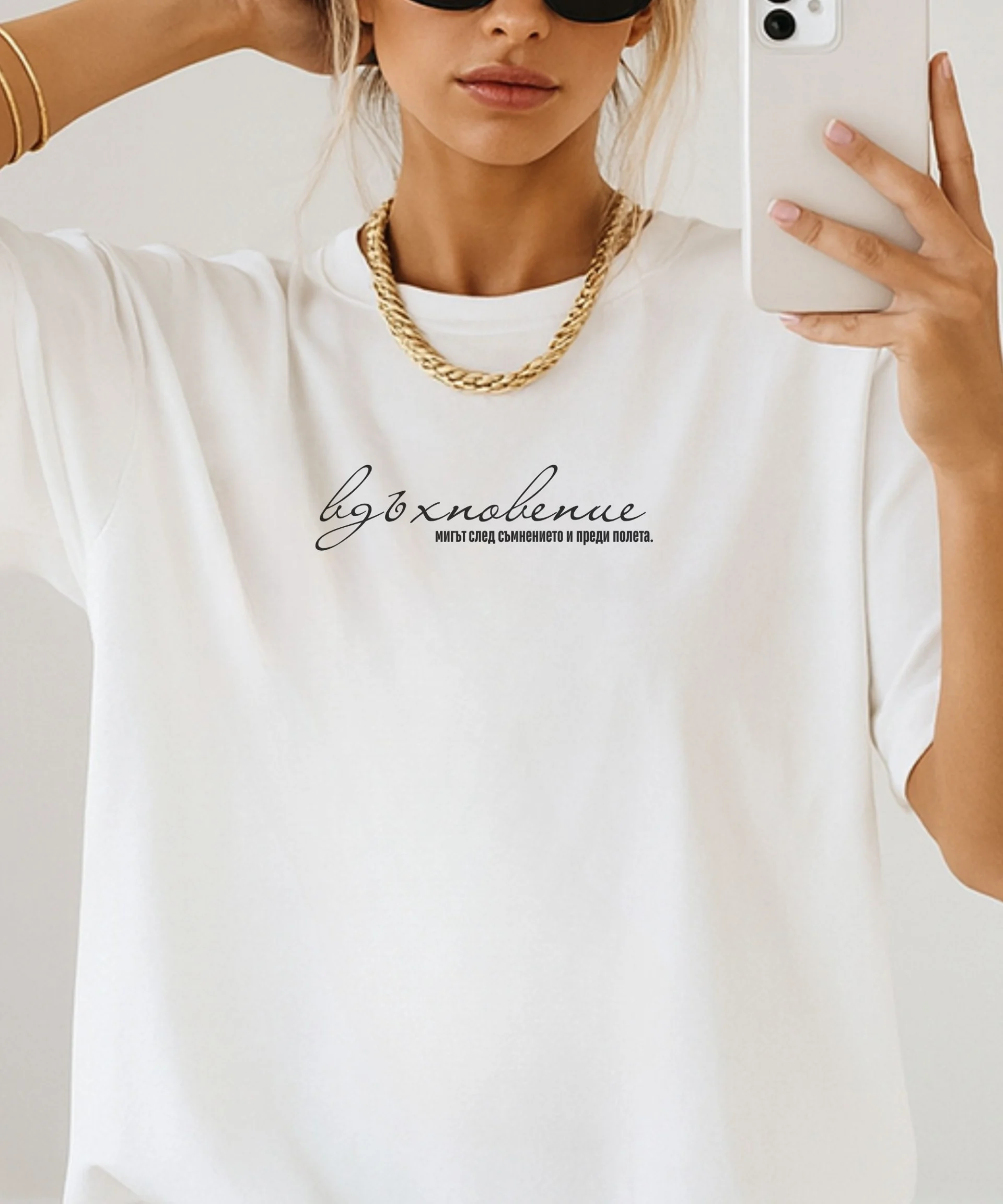 Това не е просто тениска – това е твоята лична заявка. Овърсайз кройка, плътен премиум памук и изчистен дизайн, който не е натрапчив, но говори силно. За жени, които ценят детайла, вярват в силата на думите и знаят какво заслужават.